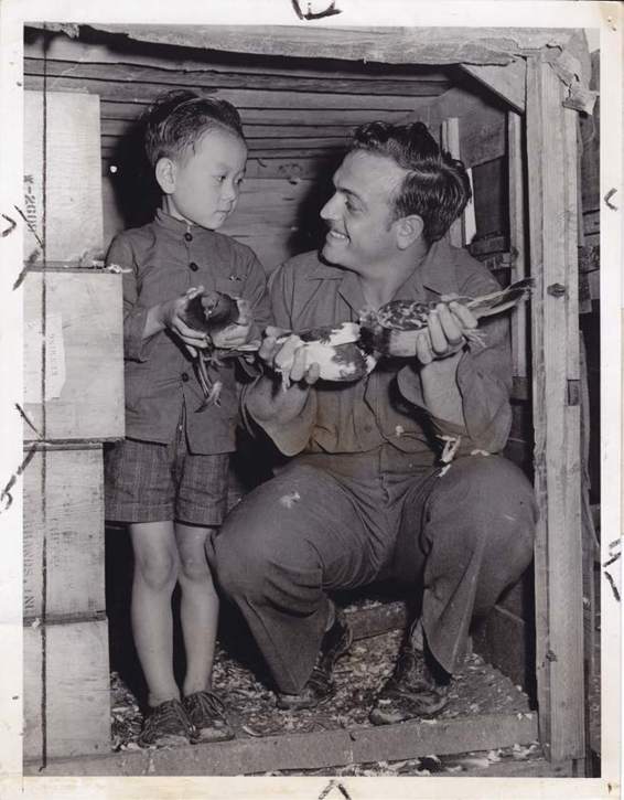 两个大自然爱好者——一个中国男孩和一名美军士兵——在中缅印战区某处的军队饭堂上方的鸽子笼里面查看由美军饲养的鸽子。这名美军士兵是来自纽约的汤尼·卡诺尼克二等兵,他在美国家乡喜欢养鸽子,并把这种爱好带到了前线。