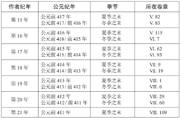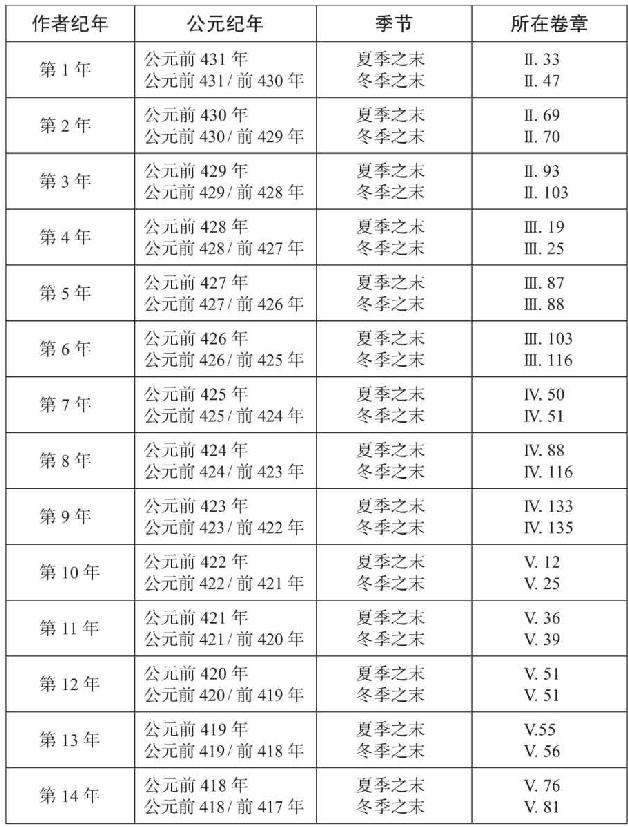 修昔底德的著作是世界历史文库中的一部杰作。作者把绵亘27年,中经议和、间歇,分散在广阔区域内的海陆战事,视为一次首尾连贯的历史事件,撰述专史论之,堪称卓识创见。《战史》的整个结构合理、紧凑,文字简洁、流畅、生动,富于哲理和感染力,显示了作者出色的史才和深厚的文化素养。全书被后世学者分为8卷,严格按每年夏季、冬季交替之序展开史事,各卷之间保持着有机的联系。其著作所涉及的年次如下表所示: