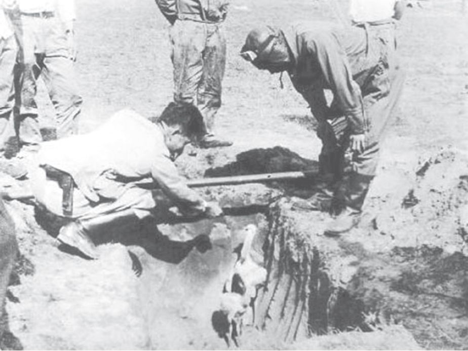 松本又恨又怕,再也控制不住自己,突然像个夜叉一样吼叫着冲出了棺材一样的掩体,一边拿着军刀在山上乱劈乱砍,一边歇斯底里地狂叫怒吼。