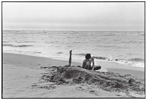 两位弄潮儿上岸休息,一人躺着假寐,另一人用沙替他覆身,渐渐就裹成木乃伊。儿时,玩伴们就是经常像这样的,比赛谁能在沙中憋气最久。这种假死的游戏虽然不危险,却会令人恐惧,因为有一种被埋葬濒临死亡的错觉。那时,想要睁眼会眨到,想要呼吸会呛住,想要喊救命定会吃进满嘴沙。越急越慌,最后只能用肩头、膝盖把厚重的沙堆顶散,再抽出手来突围,将脸上的沙层扫落再猛猛吐气、慢慢喘息才不至于吸进沙粒。那种过程还真有又活过来的庆幸。