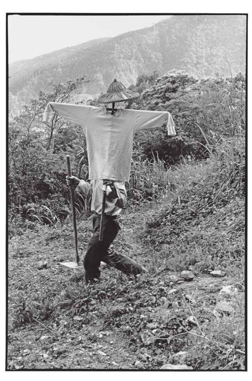 这张在宜兰县大同乡所拍的照片,农夫一手提锄、一手举着稻草人跨步行走。他耕作的并非田亩,也非菜园,而是利用北横公路拐弯处的一些山崖空地,能种什么就种什么。这样的农夫还真善待生命和物命啊!地太小又太险,不管种什么都只是一些些而已,于是他得频频移到另一处工作。这只稻草人其实也是他的衣架,天凉了有衣服可添,日晒了有斗笠可戴。嘿,他举稻草人的姿态煞是有神,仿佛是自己的化身。这位农夫是多么热爱工作与生活啊,心中无信仰的人,可难如此。