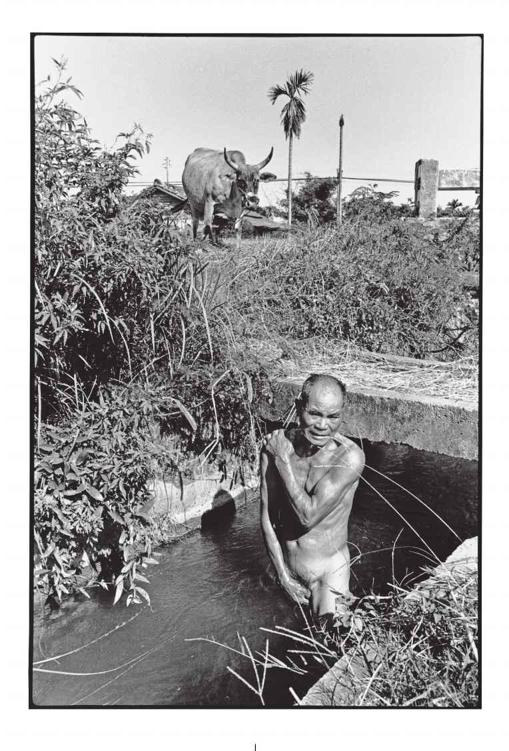 台东市马兰郊区,赭褐色的土壤、蔚蓝的天空、灼人的焚风、叶大果肥的树林,一切都充满野性。老远我就发现一位农人,在光天化日之下,于水圳中洗澡,他的牛只就拴在路旁的桥头。这是何等难得的镜头,我岂能错过!
