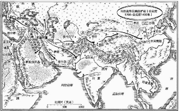 随着战车作战技术的完善,蛮族的马匹饲养者开始占有巨大的军事优势。即使只有少量战车,征服战争也变得容易了。公元前2000年之前不久已经开始在美索不达米亚周边建立地方性文明的土地贵族更容易确立统治,因为少数拥有战车的人与其他人在军事力量上已判若云泥。因此,经历了最初仅仅以破坏(这些破坏降低了印度和克里特文明的水平)为主的阶段后,蛮族征服者开始在希腊和印度建立他们自己更野蛮、军事力量更强大的文明方式。古典希腊和印度文明都起源于这种方式。同样的情况似乎也发生在遥远的中国,战车武士的到来可能创立了商朝(传统上,按照最短的纪年,商朝是公元前1525~前1028年)。可以肯定的是,在中国传统文献中,商朝是第二个朝代,在他们到来之前,夏朝为中国文明奠定了许多基础。但是,商朝战车兵为中国社会和政府带来了重要的新动力和新方向。