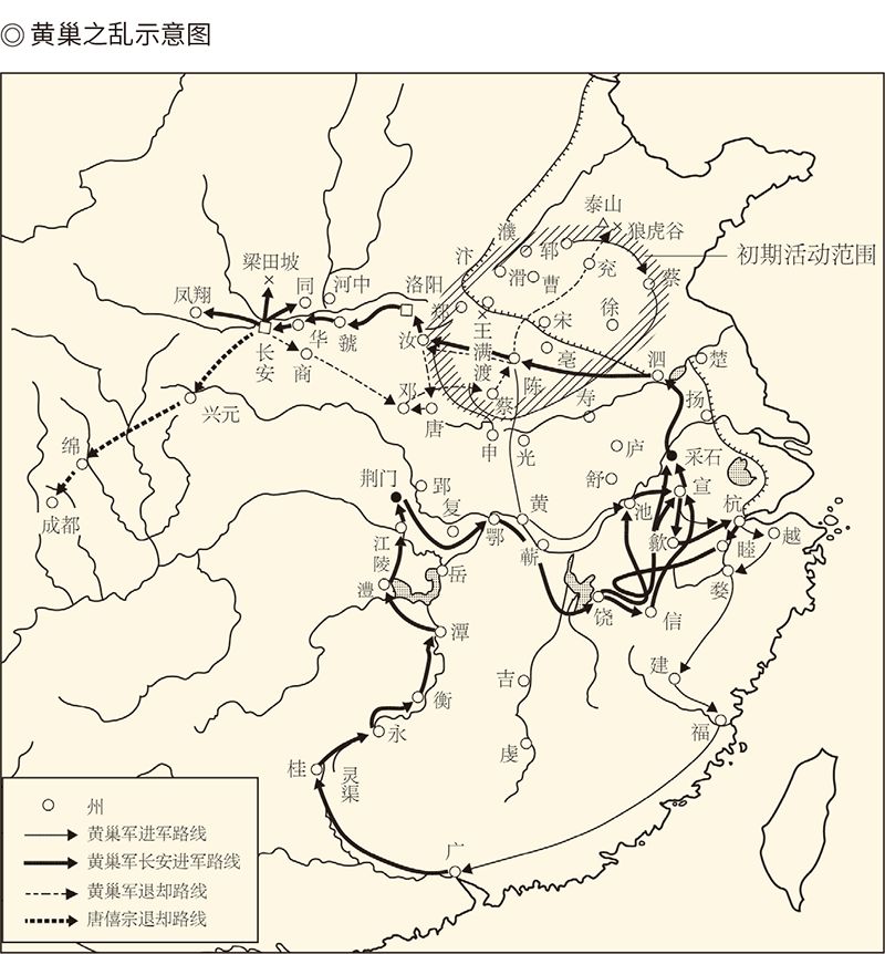 老实说,官僚机构腐朽如此,执政集团昏聩如此,再不垮台真是天理难容。事实上就在一年前,濮州(今山东省鄄城县)的王仙芝便已发起暴动。生活在今天山东省菏泽市的黄巢参加这支起义军,则正在一个月前。只不过后来王仙芝战死,黄巢接过了旗帜把事业做得更大。