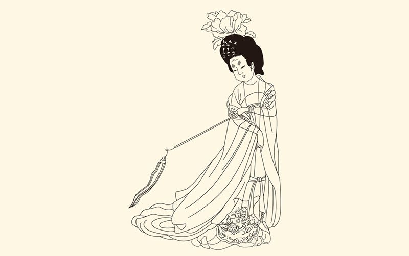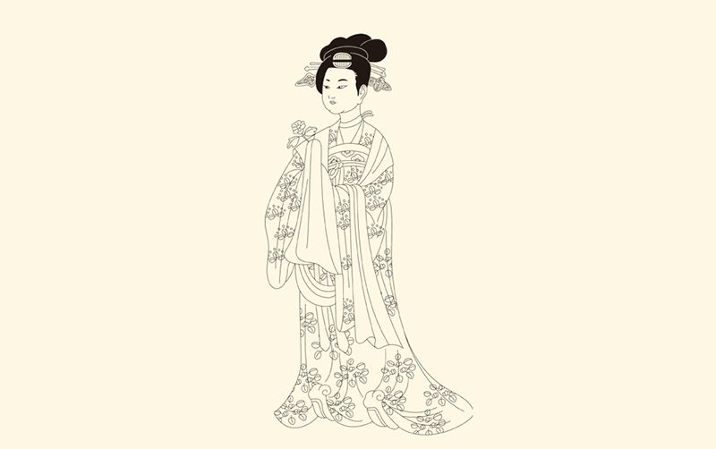 晚唐时期,选自周昉《簪花仕女图》。图中女子梳高髻,上插牡丹花,身穿大袖纱衫,披锦绣罗帔,下着长裙。