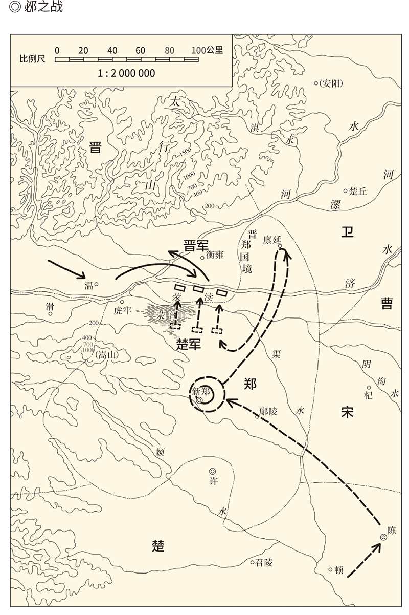 与此同时,晋国的大军也浩浩荡荡地开了过来。他们是听说郑都被围,闻讯赶来的。在晋楚两国的争霸斗争中,郑是晋国的小兄弟。小弟挨打,老大岂能坐视不管?当然要出手。