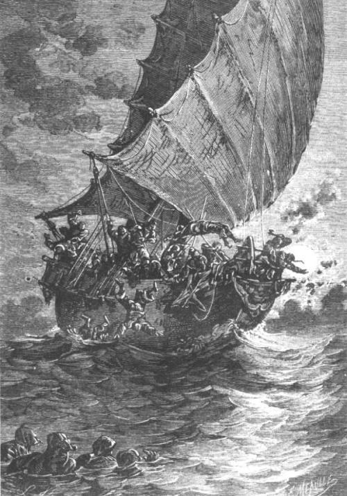 突然,从船上传来了大吵大闹的声音,一群人冲上了甲板,向船员发起了袭击。真是一阵可怕的骚动,开始是愤怒与咒骂,后来变成了痛苦与绝望的尖叫。然后是一片寂静,喧哗声消失了。船边传来“扑通”“扑通”的落水声,他们的尸体都被扔出了船外。