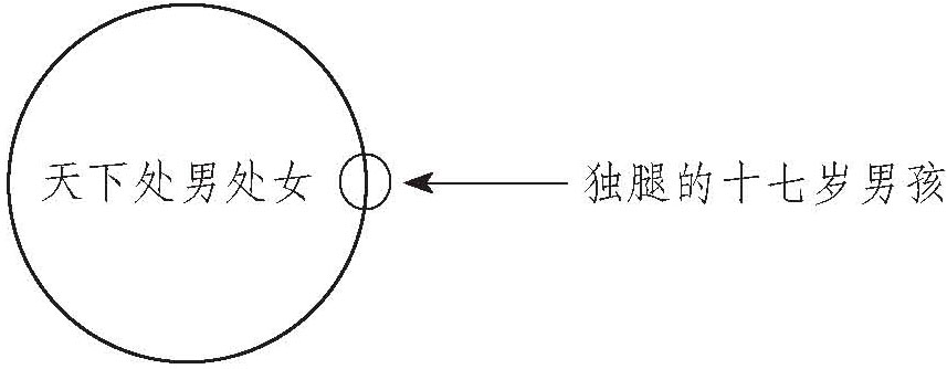 我们就那样站在走廊里,他不领我去他的房间,我也不知道他的房间怎么走。就这样僵持了一会儿,我开始觉得他是在想法子避免跟我亲热。我觉得自己刚才压根就不该提出这个建议,太不淑女了,所以让奥古斯塔斯·沃特斯觉得反感了。他站在那儿眼睛一眨也不眨地看着我,一定是在想办法从眼下这种局面里礼貌地脱身。然后,不知过了多久,他开口说:“在我膝盖上方,它就是……有点变细了,然后就是……皮肤,有一道可怕的伤痕,但看上去就像……”