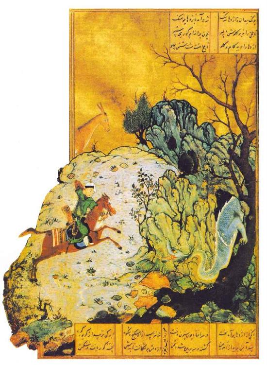 [7]设拉子:伊朗南部大城市、为今伊朗法布斯省省会。帖木儿王朝沙哈鲁(1405—1446年在位)统治时期,沙哈鲁的侄子伊斯坎达尔·米尔扎为设拉子总督(1409—1414年在位),酷爱细密画艺术,使设拉子成为了当时的艺术之都。沙哈鲁的第三子易卜拉欣·苏尔丹继伊斯坎达尔·米尔扎之后统治设拉子20年(1414—1433年),继续大肆网罗细密画家,狂热地为多种文学著作绘制插图,形成“设拉子前期画派”。该画派的代表作菲尔多西的《列王记》现收藏在牛津波德廉图书馆。在萨法维王朝时期(1502—1735),设拉子依然是细密画艺术中心之一,形成“设拉子后期画派”。