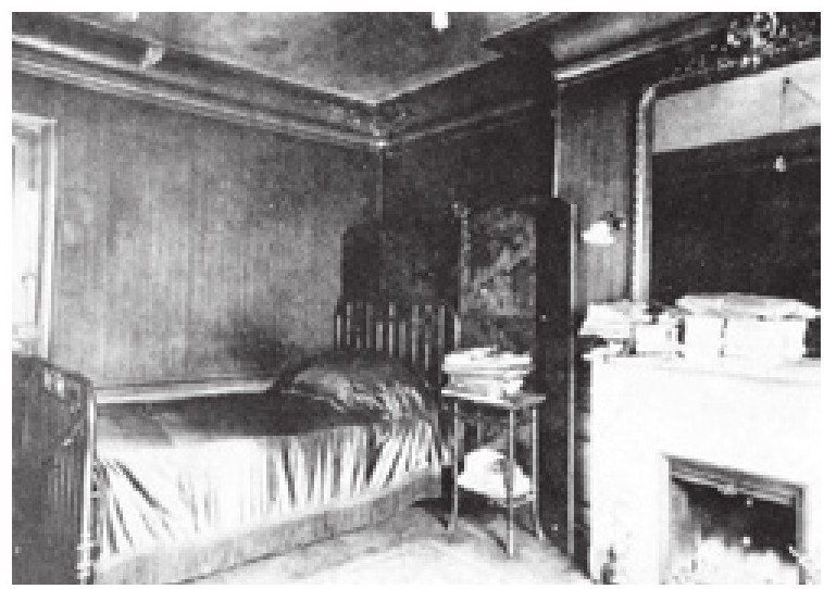 他的房间有两道门:一道是双扇门,通常用作客人出入;另一道更加私密一些,靠近床,可以通向浴室。房间里有张床,床的支柱是镀了铜的,在烟熏火燎之下早已被染黑了。此外,还有一个或为访客或为塞莱斯特准备的大扶手椅,三张竹制的小桌子(他称为“小型护卫舰”,可能是因为这些桌子不太稳当),上边放着他的笔记本、烟熏疗法所需的材料(止哮喘的勒格拉香粉和用来点燃香粉的纸盒)、依云牌矿泉水、写作用品(笔、墨水)、一叠手帕,以及其他一堆散乱堆放的物品,诸如药片、最近收到或是留存已久的信件、杂志、新闻报纸、几副眼镜、怀表和止鼾喷雾。如果他不小心弄掉了什么东西在地上,比如说他的笔杆,他就会摇铃叫塞莱斯特捡起来。床头有一盏灯,灯罩是绿色的,还有三个梨状的电器,其中两个就是用来摇铃的。床边是个壁炉,壁炉沿上放着几本书和写有手稿的漆布封面笔记本。墙壁上的那扇窗永远是紧闭的,覆盖着蓝色绸缎大窗帘。这个房间,第一眼看上去就知道是典型的马塞尔·普鲁斯特式房间。