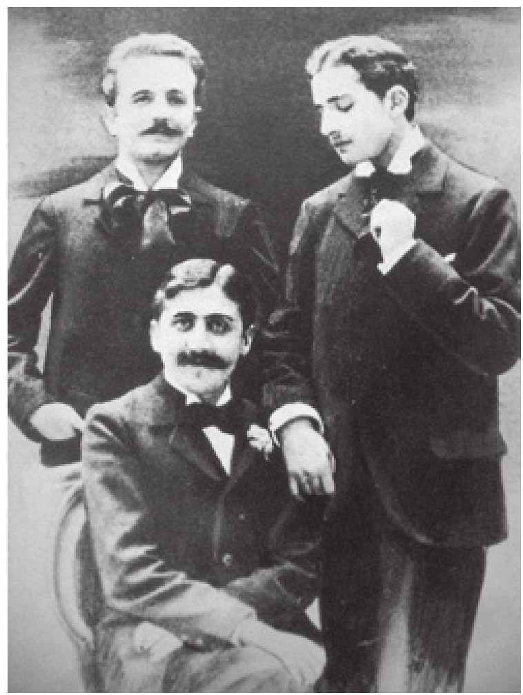 普鲁斯特与罗伯特·德弗莱尔(后左)和吕西安·都德(后右)。都德把手搭在普鲁斯特的肩膀上,并以炙热的眼光凝视着他。从此,普鲁斯特的母亲发现了他的性取向异常。