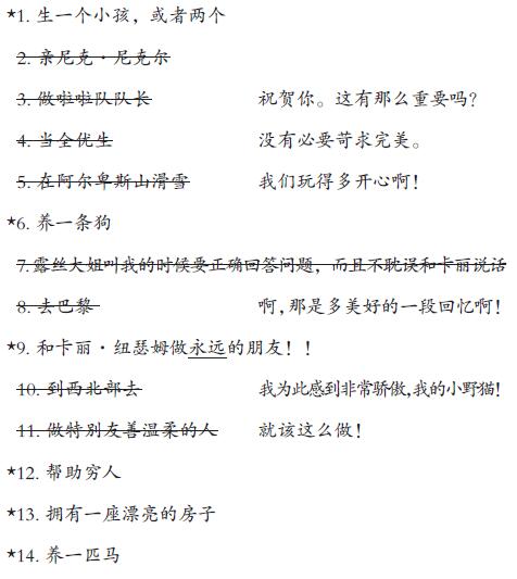 过了好几秒钟,我才认出来,这确实是我的笔迹。我十四岁华丽的字迹。显然,我自己写了一份人生目标,虽然我对此毫无印象。在我写下的某些目标旁,我看到了妈妈的评论。