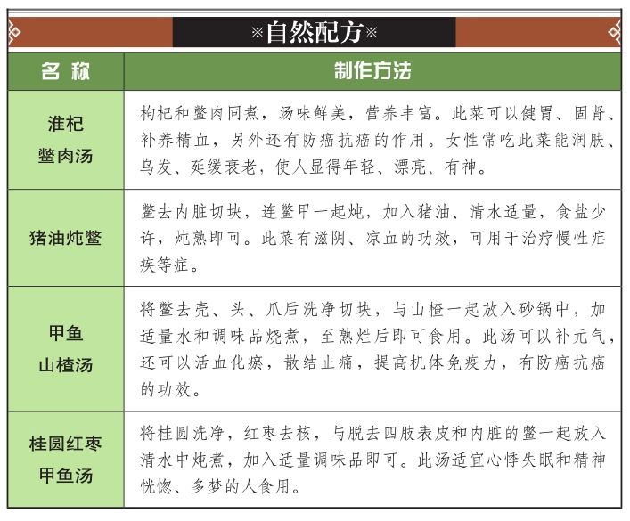 鳖的肉味鲜美、营养丰富,是一种高级水产品,它有活血化瘀、滋补强身的功效,通常将它作为病后或手术后身体虚弱者的滋补保健食品,同时还有防癌治癌作用。