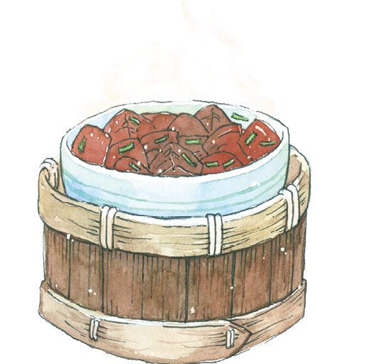 先用小瓷钵装肉,将肉切成方块,加甜酒和酱油。再装进大钵内,封好钵口。放入蒸锅内,下面用小火干蒸,不超过两支香的时间,不用加水。酱油和酒的多少,看肉的多少而定,要淹盖住肉面。
