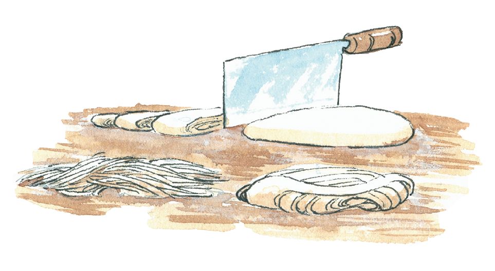 一条大鳗鱼蒸烂后,撕下鳗鱼肉扔掉骨头,鳗鱼肉和在面粉中,加入鸡蛋清揉面,再擀成面皮,用小刀划成细条,放进滚开的鸡汤、火腿汁或蘑菇汤里煮熟。