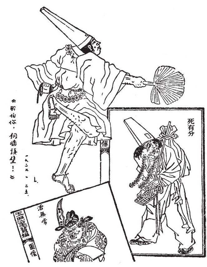 然而我还不能心服。一者因为这些书都不是我幼小时候所见的那一部,二者因为我还确信我的记忆并没有错。不过撕下一叶来做插画的企图,却被无声无臭地打得粉碎了。只得选取标本各一——南京本的死有分和广州本的活无常——之外,还自己动手,添画一个我所记得的目连戏或迎神赛会中的“活无常”来塞责,如第三图上方。好在我并非画家,虽然太不高明,读者也许不至于嗔责罢。先前想不到后来,曾经对于吴友如先生辈颇说过几句蹊跷话,不料曾几何时,即须自己出丑了,现在就预先辩解几句在这里存案。但是,如果无效,那也只好直抄徐(印世昌)大总统的哲学:听其自然。