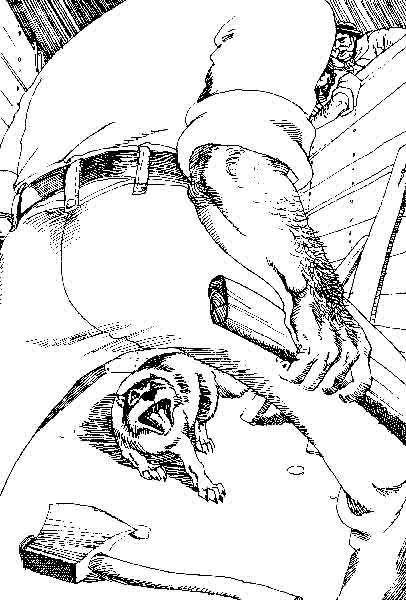 那个疲惫不堪的晚上所剩下的时间里,它都躺在板条箱里,心中充满着愤怒和受伤的自尊。它不明白眼前发生的一切意味着什么。这些陌生人想将它怎么样?他们为什么要把它关在这只狭小的板条箱中?它不知道为什么,但是,它隐约觉得大祸即将降临,于是它心里很难过。夜里,小仓房的房门几次被嘎吱地打开,它都跳起身,希望能看到法官或至少看到那些男孩子。但是,每次看到的都是沙龙老板的那张鼓鼓的脸,在借着牛蜡烛的惨淡光亮窥视它。因此,每次在巴克喉头颤动的欢快声都转变成了疯狂的嗥叫。