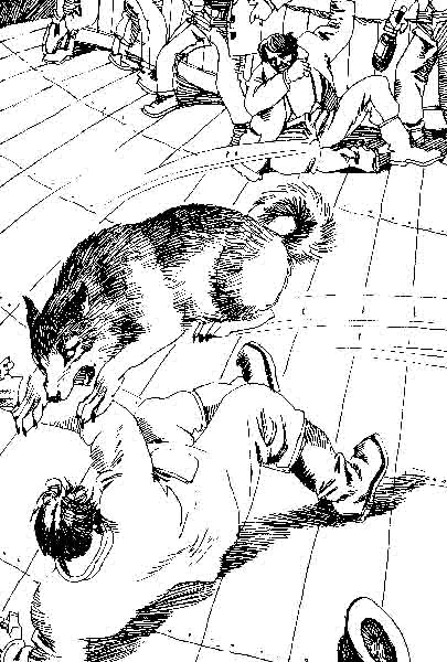 这时,只听一声吼叫,旁观的人耳中听到既不是狗叫,也不是犬吠,那叫声称做咆哮最合适不过,只见巴克离开地面,向上纵身一跳,扑向伯顿的咽喉。伯顿本能地伸出手臂挡住,才保持了命,但是他摔倒在地上,巴克骑在他的身上。巴克松开咬住他手臂的牙齿,再一次去咬他的咽喉。这回,伯顿没有完全挡得了,于是,他的咽喉被撕咬开来。这时,大伙扑向巴克,将它赶开;但是,当外科医生检查流血情况时,它还在那里徘徊着,狂怒地嗥叫着,试图冲进去,被一排棍棒赶了回来。于是,当场召开了“矿工会议”,判定狗容易发狂,于是巴克被驱逐出了门。但是它却因此出了名,从那天起,它的名字传遍了阿拉斯加的每一个营地。