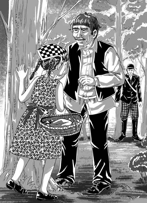 “哎呀!”我心想,“是他自己编的呢……”他忽然哆嗦了一下,注视着树林深处,不唱了。我回头一看,看见一个七八岁的农家小姑娘,穿一件蓝色小褂,头上裹一块格子头巾,一条晒得黑黑的光胳膊挎一个篮子。她大概怎么也没想到会遇见我们,如一般人常说的,“撞见”我们,所以她一动不动地站在青葱浓密的榛树丛中阴凉的草地上,用她那双乌黑的眼睛惊惶地望着我们。我刚刚把她看清楚了,她一下子就钻到树后面去了。