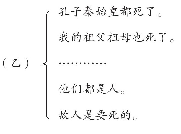 (甲)式仍是演绎法,不过所根据的大前提更普遍了。(乙)式是以个别的事物为根据,得到较普遍的判断,这方式和演绎法显然不同,叫作归纳法。