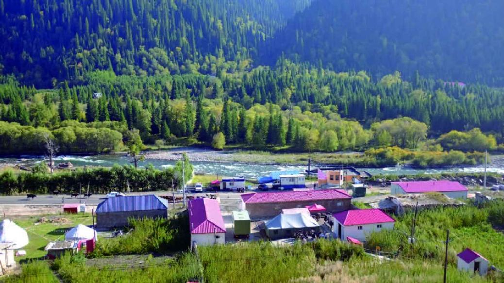 这一个地方,我不知道是否可以称之为村落,居住的牧民并不多,公路两旁只有几处房子以及一些零散的毡房。公路下面,清澈的伊犁河蜿蜒而过。河堤两岸是密密麻麻的树木,初秋季节,树叶已渐渐变黄,却还未到金黄一片,青黄交接,别有风味。