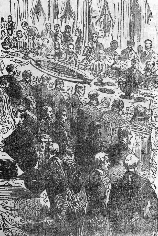 会议结束后,博士和人们一起来到位于帕尔玛尔大街的“旅行者俱乐部”。为了向他表示敬意,人们在这里为他准备了一场丰盛的宴会。这场宴会的规格和被邀请的人物的重要性是一致的。在这场豪华的宴会上,餐桌上的鲟鱼大得异乎寻常,它的尺寸简直比塞缪尔·弗格森本人的身高都短不了1英寸。