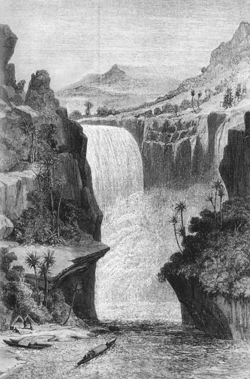 很快,气球开始沿着尼罗河的河床前进,此刻它距离地面的高度几乎不到100英尺。在这个河段,尼罗河的水流非常平缓,河床宽度达到了300英尺。这时,本地土著被大大激怒了,他们来回奔跑着,只见河水两岸的村庄乱成一团,到处都是人的吼叫声。在北纬2°这个地方,有一个落差为10英尺的小瀑布,因此渡船根本不可能通过。