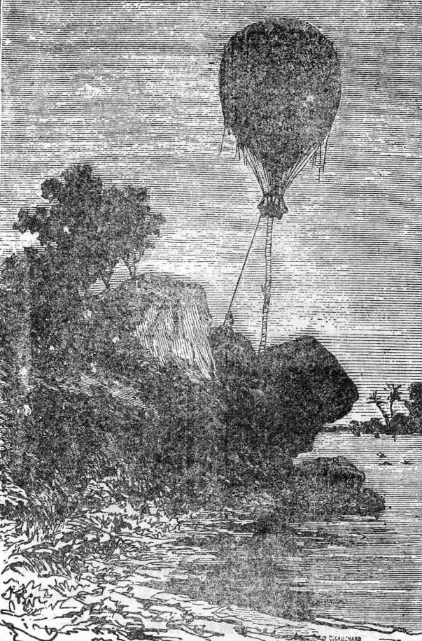 于是,这些黑人开始四散逃窜。他们一头跳进河水,很快游到了对岸。然后,子弹如同阵雨一般从河水两岸射来,其中还夹杂着如云一般黑压压的利箭。然而,这些子弹和利箭对气球已经构不成任何威胁,因为铁锚已经牢牢地卡住了岩石的裂缝。很快,乔便顺着锚索滑到了地面上。