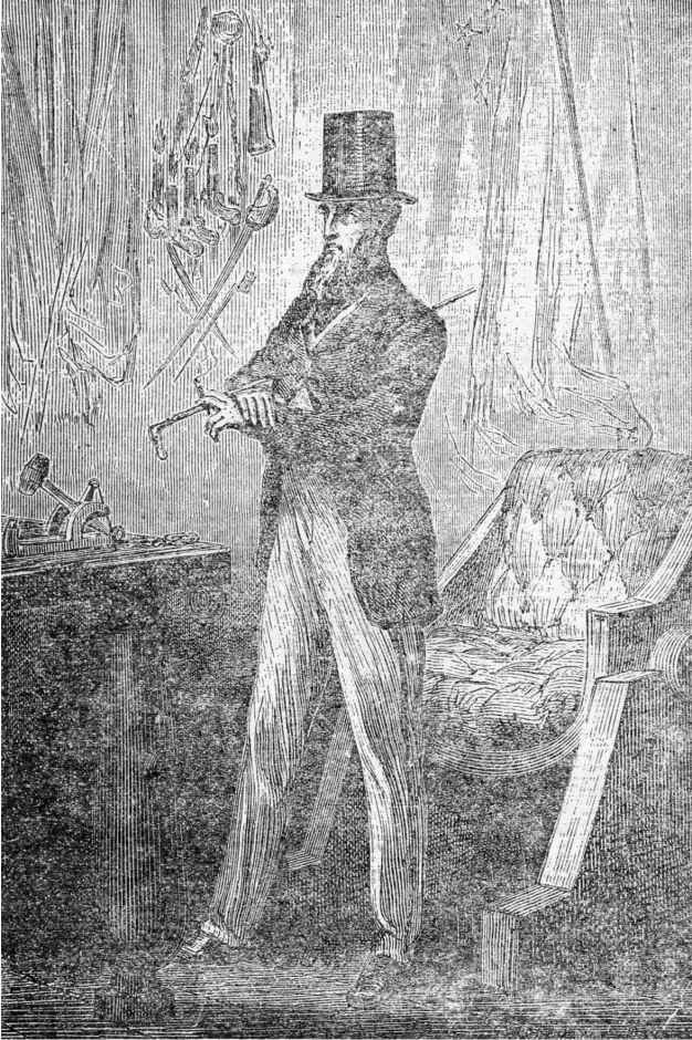 此时,他正坐在椅子里,一言不发,全神贯注,在沉思着什么。他被一顶高高的像皇冠一样的帽子遮着——那是一种美国人往往会紧紧勒在头上的黑色的、形状像桶一样的东西。