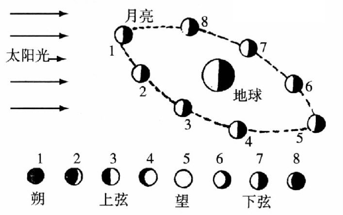 等到那些愚昧无知的人们也像天文台的台长一样懂得月球的自转之后,他们又为月球绕地球公转的问题操起心来。于是马上就有20种科学刊物争相帮忙。这些刊物告诉人们,繁星闪烁的天空可以被看成是一个钟表的表盘,月亮在这个表盘上移动,给地球上的居民指出钟点。那就是,这个主宰黑夜的女王在其运行中会呈现出不同的月相,当她面对太阳时,也就是说我们这三个天体形成一条直线而地球居中时,她就是满月;当她背对太阳,也就是,她处在地球和太阳中间时,就呈新月的模样;最后,当她与太阳和地球形成直角而她又位于直角的顶端时,就出现上弦月或下弦月。