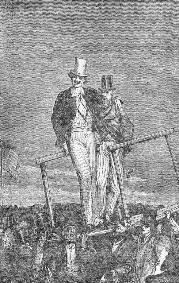 庞大的胜利游行队伍不停地扯着嗓子嚷嚷着。米歇尔·阿当容光满面,得意洋洋。那台子有好几次左右摇摆,前后颠簸,像一只遇到风浪的船,但两位英雄都生就了两条海员的腿,纹丝不动站得很稳。他们的船毫发无损地驶入了坦帕港。