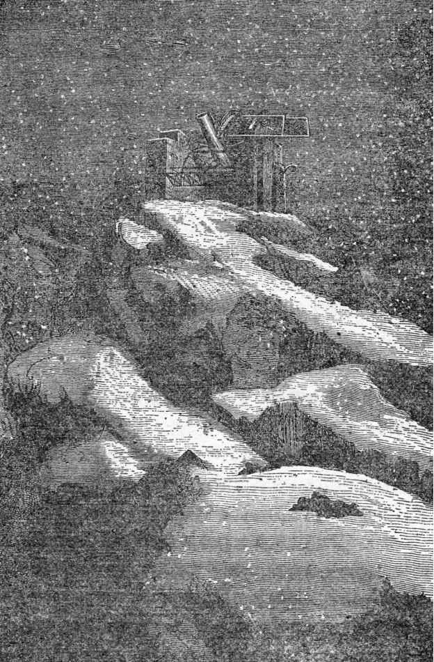 至于这些美国工程师们所克服的种种困难以及他们展示出来的大无畏惧的天才和精湛技艺,不是笔墨和语言能描述清楚的。他们必须远离人烟,到人类几乎无法生存的原始荒野里去。他们穿过没有人迹的草地和密不透风的大森林,跨过湍急的河流,爬上终年积雪的大山,把巨石、大量的铸铁、笨重的角铁、硕大的镜筒部件和重达30000磅的反光镜抬到10000多英尺的山顶上去。但是美国人的天才克服了这些数不清的障碍。到了9月底,不到半年的时间,一架巨型的反射望远镜落成了,长度是284英尺,巍然矗立,高耸入云。望远镜被一个巨大的铁架子支着,通过一台精密的装置对其操纵控制,使它可以随意对准天空的任何地方,从一边的地平线追踪着空中的天体,一直追踪到另一边的地平线。
