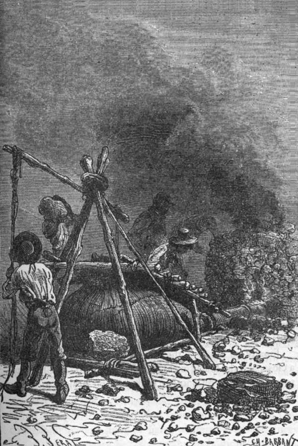 第二天是4月21日,赛勒斯·史密斯上一次在这块土地上已经发现了铁矿石的标本,这一次他叫上赫伯特,准备去找古代生成的土层。他们在东北靠近红河发源地的一个支脉下发现了矿脉,而且这里的矿石就露在地面上。这种含铁量很大的矿石很容易熔化,非常适合工程师准备用的还原炼铁法,也就是加泰罗尼亚人(1)常用的土法,不过像科西嘉人那样把这个方法简化了。一般的土法是需要熔炉的,还要制造几个坩埚,在坩埚里把矿石和炭一层夹一层地放进去,再让它变化和还原。可是赛勒斯·史密斯没有打算用这些复杂的设备,只打算把矿石和煤做成一个立方体,再用风箱把空气鼓入立方体中心。无疑,这办法是蒂巴尔·凯斯(2)和世界上最早的冶金学家惯常采用的。既然亚当的孙子能够用这个方法取得成功,还在铁矿和燃料丰富的国家里收到不错的效果,那么林肯岛上的人们也一样会取得成功。