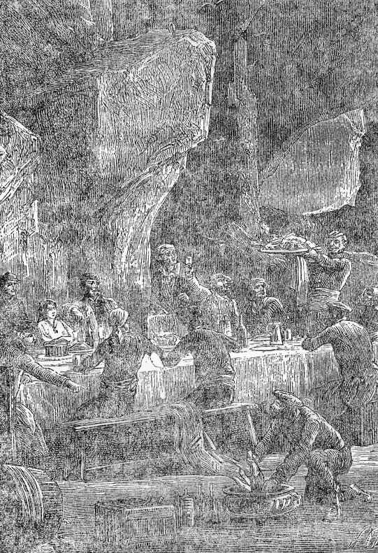 第二天,当太阳升起后,法国人、俄国人、西班牙人和意大利小女孩尼娜,每个人都神态庄重地聚集到了岩洞的大厅,然后在长桌前坐下来,似乎每个人都为能够参加加利亚星球的第一次盛大庆祝活动而感到高兴。本·佐夫和“多布里纳号”的厨师的烹饪技艺令人们赞不绝口。至于宴会的饮品真是丰富多彩,都是“多布里纳号”上储藏的各种名酒,不但有法国酒、西班牙酒,还有俄国的茴香酒。