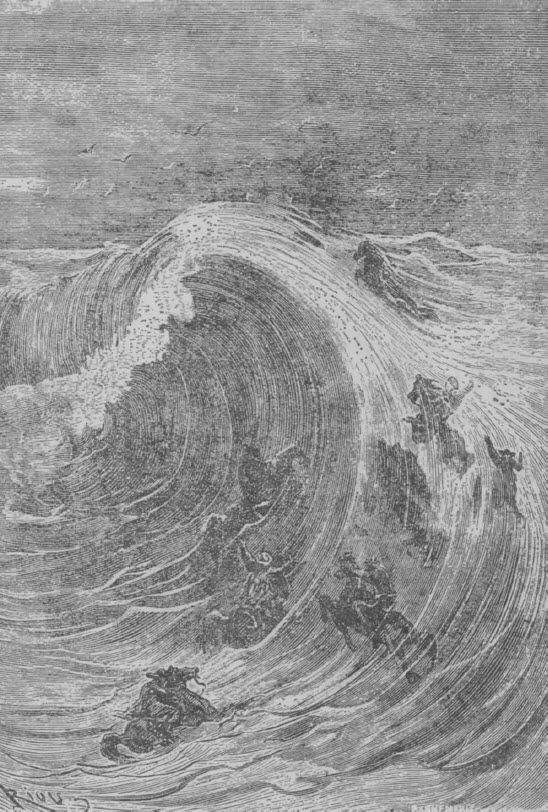 少校话音还没落地,一个40多英尺高的巨浪劈头而至,发出雷鸣般的声响,扑在那一群落难人身上。全队连人带马被卷入了泡沫飞溅的大漩涡里,不见了踪影。千万吨洪水汹涌澎湃地卷着这群人马转来旋去。浪头过后,人又泛了上来,相互赶快点了下人数。好在人都安然无恙,但马匹,除了陶喀还驮着主人之外,其余的都杳无踪迹了。