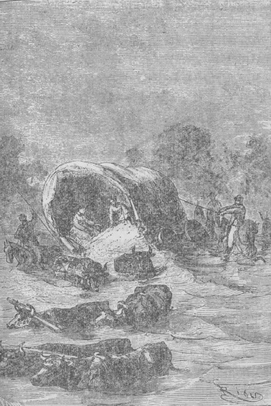 幸亏,艾尔顿眼疾手快抓住牛轭,用劲一扳,这才把车子扭转过来。前面河底是一道小坡,牛马这才稳住脚步。一会儿,人畜都安全过了河,大家虽然浑身湿透,心里却比较满意。