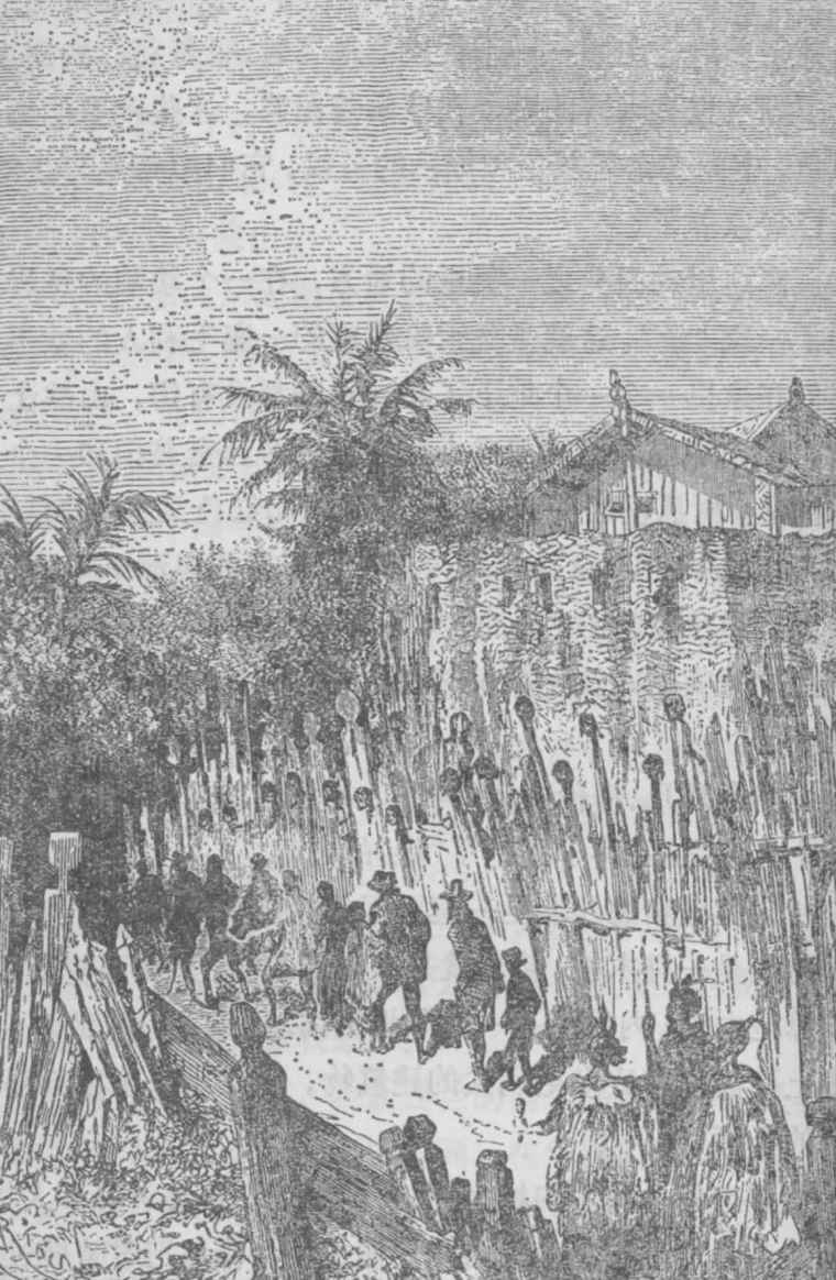 俘虏们进入内城,看见外面的木桩上挂满了骷髅,不禁为之悚然。海伦娜夫人和玛丽小姐立即转过脸去,她们并非胆小害怕,实在是看着恶心。无疑,这些头颅都是土著人的战利品,至于那些战败者的身子,早已成了战胜者的下酒肴了。