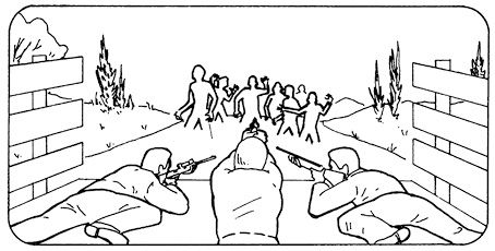 这种战术完全不同于流窜行动,机动歼灭是慢速、平和的系统性策略。猎手们乘坐在动力强大、保护性强的大型车辆里,以不超过10英里的时速在蔓延地区搜索。一旦发现猎物,猎手们便齐齐向其射击,直至所有站立物体都全部倒下为止。这种情况下,卡车是最实用的了,因其能为猎手们提供较为轻松安全的有利位置。尽管这种战术已经降低了扫尾工作所需时间,但还是要注意对每具尸体进行一定的检查处理。对这种战术来说,即使慢速度使得城市地区也可以采用,但总的来说,开阔地段是最有利的了。显然,对所有要用到机动车辆的方法,都应该尽量避免在障碍密集处、热带地区使用。再强调一次,机动歼灭和流窜行动一样,都需要有大型彻底的扫尾工作。在越野车顶上射击是根本不能威胁到那些躲在池塘、衣橱、下水道或是地下室的僵尸的,因此,确保收尾工作有效进行。