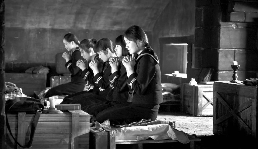 此刻走过来一个扛着大花瓶的日本兵,玩笑地踢了一脚靠着钢琴休息的日本兵,那个日本兵追打上去,扛花瓶的日本兵为了躲避追打,险些把扛在肩上的花瓶摔下来。