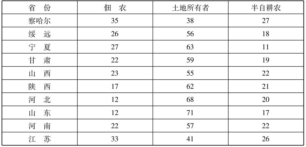 20世纪上半叶中国的土地所有权的一般模式是许多人都了解的。除了少数例外,土地租佃的情况在中国东北和南方较为普遍,在华北则较少。我们很难取得准确的统计数据。因此,在大部分情况下,我们只能将现存资料当作真实情况的一个近似值。人们自然会想到,这样的资料或许反映了数据搜集者的政治偏见。尽管的确可能存在这样的问题,但不同资料中有关土地租佃的数字是基本一致的。引用最广泛的是国民党政府实业部国家农业调查局公布的数据。该数据显示,在20世纪30年代,大约30%的中国农村家庭是租种他人土地的佃农,24%的家庭拥有一部分自己耕种的土地,46%的家庭是完全的土地所有者。因此,70%的中国农民或多或少拥有一些土地,但超过50%的中国农民耕种的土地是租佃性质的——或者是全部,或者是一部分。[7]