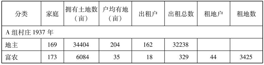 在滨海地区另一组12个村庄(见表2,B组村庄)中,2265户农户共有30028亩土地。其中,251个家庭将大约3000亩土地租给540个佃农家庭。超过一半的农户被划分为贫农。但租赁土地的家庭只有326户,在这一组被调查的村子里,完全的佃农和全部农民的比例大约为14%。[16]