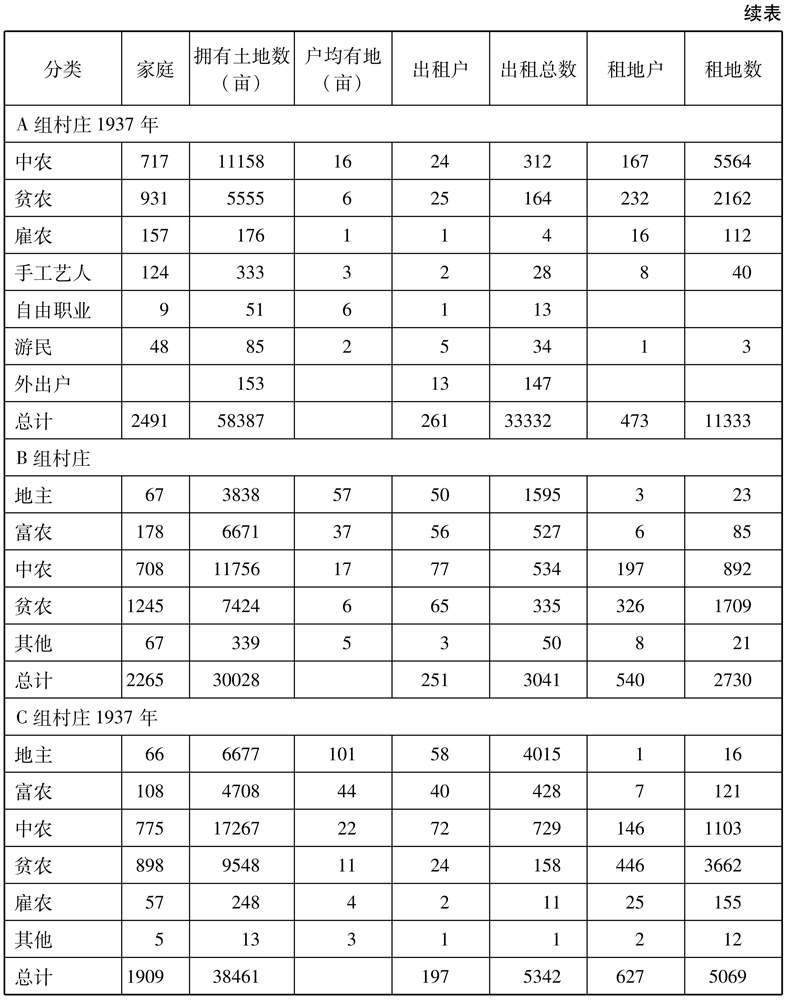 对滨海地区临沭县的第三组12个小村庄(见表2,C组村庄)的调查发现,总共1909个家庭拥有38461亩土地。其中,197个家庭将5300亩土地租给627个佃农家庭。在佃农家庭中,446户被划分为贫农。在这一组被调查的村子里,佃农大约占贫农总人数的一半。佃农和全部农民的比例达到了相对较高的23%。[17]