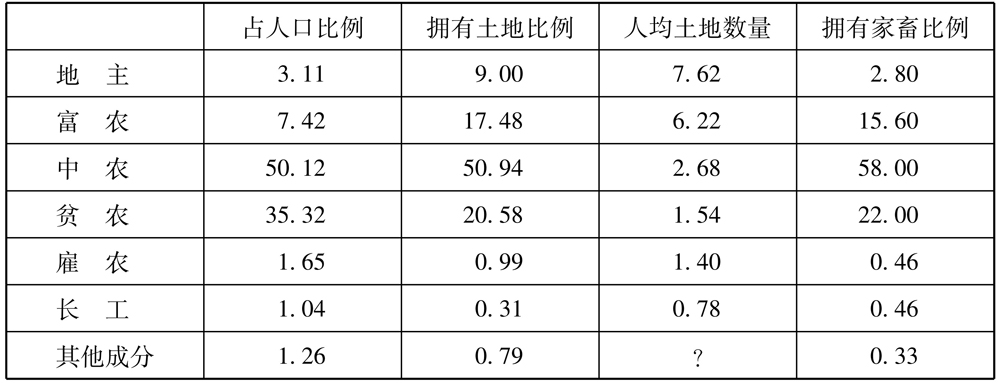 我们还可以引用另外两个例子。韩丁对山西东部潞城县的一个村进行了考察,解放以前村里的构成如下:贫农的比例为46.8%,雇农为6%,中农为40%。这个村约有250个农户,其中只有1户是完全的佃农。[24]对(河南北部)涉县的一个村的调查发现,土地改革之前,该村979个家庭中,600个家庭要么是中农,要么是刚刚成为中农,300个家庭被划归为贫农。共产党解放这一地区几年之后,1946年,这个村开始进行土地改革。这个村开展了至少两次减租运动和其他斗争,因此有许多农民变成了中农。[25]