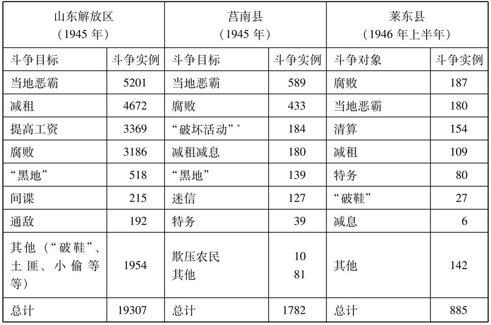 结果 根据记录,在1944—1945年间,莒南县开展了1782次斗争活动,最终消除了“发动群众的大部分障碍”。斗争的主要目标是地方恶霸和腐败,其次是减租减息。在莱东县,地方恶霸和腐败同样是斗争的主要对象。表4列出了莒南县、莱东县,以及整个山东解放区的斗争对象及次数。[69]