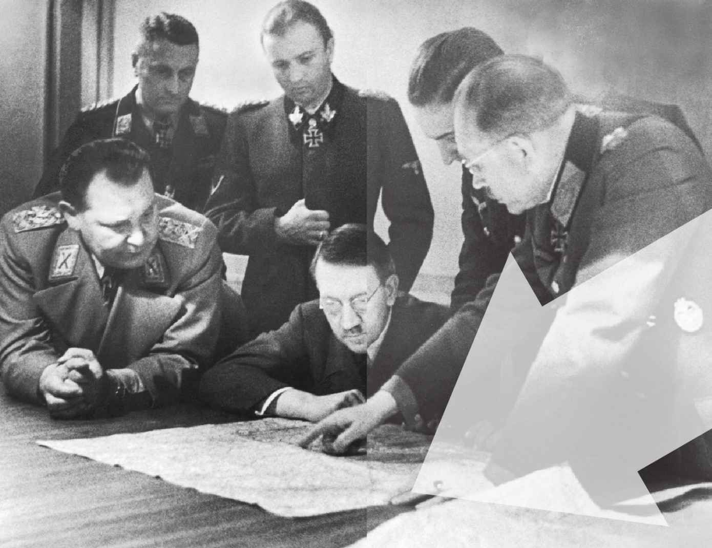 将军们向元首行了举手礼,我看得出各位将军脸上据说密布数月的阴云似乎消散了一些。元首示意他们到沙盘前来,自己却站住,用非常夸张的期待表情注视着党卫军全国总指挥泽普·迪特里希和哈索·冯·曼陀菲尔将军。