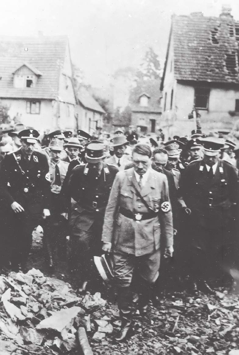 1944年,满脸愁容的希特勒正在废墟瓦砾中视察被盟军轰炸机摧毁的德国城镇。时间:1944年12月25日