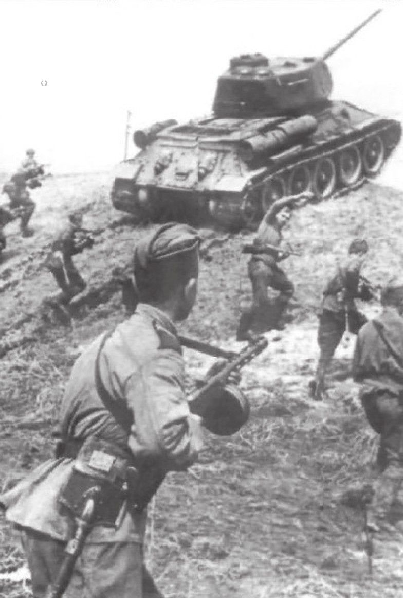 苏军T-34∕85中型坦克带领装备“波波沙”冲锋枪的苏军步兵进行突击。时间:1945年1月17日