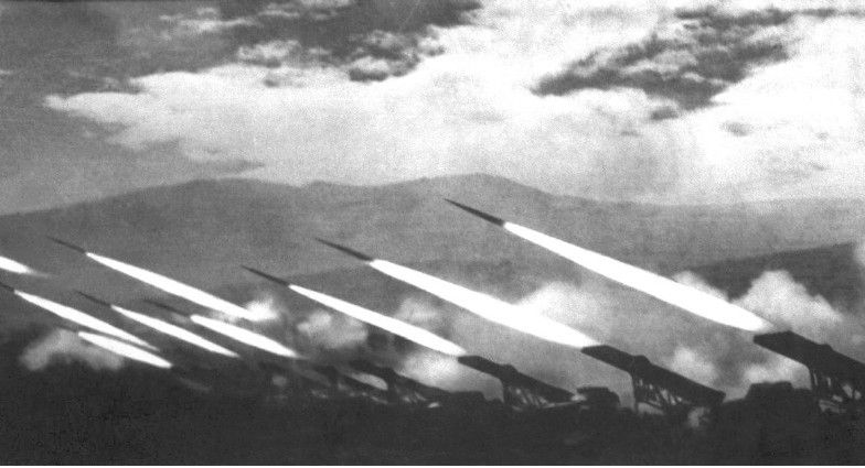 正在进行齐射的苏军“喀秋莎”火箭炮,德军将这种恐怖的武器称为“斯大林管风琴”。新哈登贝格的战斗异常激烈,德军士兵使用反坦克手雷向苏军坦克发起进攻,加上掩体内部署的88毫米反坦克炮,使波格丹诺夫的苏军坦克损失惨重。德军第111教导旅1个突击炮连从浓烟中杀出,摧毁了大量苏军坦克。作为攻击前锋,格纳特的单车就摧毁了7辆,第2天他的战绩达到了44辆,海因里希后来授予他“骑士勋章”。