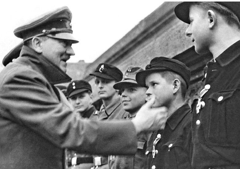 希特勒最后的几张照片之一,在帝国总理府花园里,他接见了一些只有12—16岁的希特勒青年团士兵。这里的建筑非常漂亮华丽,他们穿过巨大的房间,高大的房门一直开到了天花板,虽然部分遭到破坏,但仍然不失纳粹的风格。当他们见到希特勒的时候,所有人都向这位元首献上了祝福。然而,他们的元首看起来似乎比实际年龄要老上20岁。宴会上,所有人都主张希特勒向巴伐利亚转移,然而自信满满的希特勒却丝毫没有畏惧感,因为他坚信苏联人到达柏林前就会被全部歼灭。希特勒又下令让邓尼茨担任德国北部地区的指挥官,而戈林一再强调自己能够指挥巴伐利亚地区的战斗。但是,希特勒没有再理他。因为在元首看来,他最亲密的战友必须勇敢,而不应该胆小,会像戈林那样炸毁别墅并偷运财物。