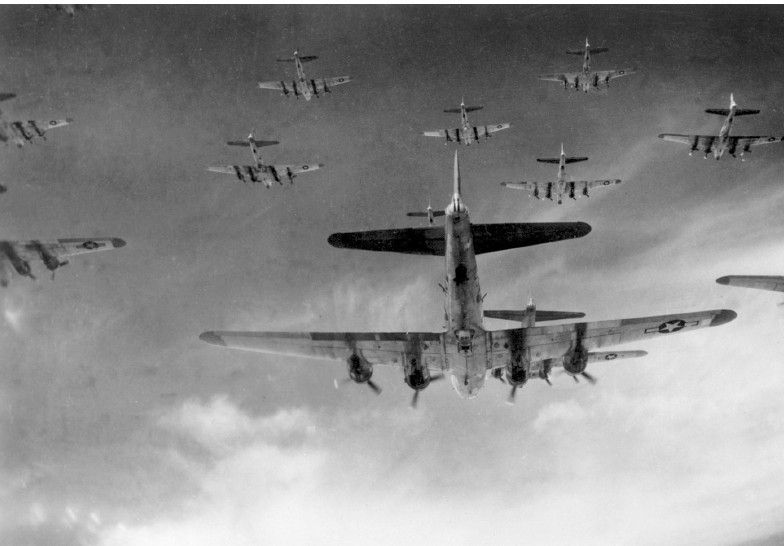 1945年,飞抵柏林上空的美军B-17“空中堡垒”式轰炸机机群。希姆莱回到了霍恩吕兴的疗养院,他计划与红十字会的贝纳多特、犹太人大会的马苏尔会面。希姆莱会见这两个人的目的是为了与西方盟国建立一个通信渠道。在希姆莱看来,他现在完全可以取代元首的地位。尽管他对希特勒依然忠诚,但他希望能与盟军进行谈判。